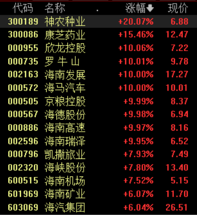 海南板块集体爆发,海马汽车、海南高速、海南发展、京粮控股等近10股涨停。